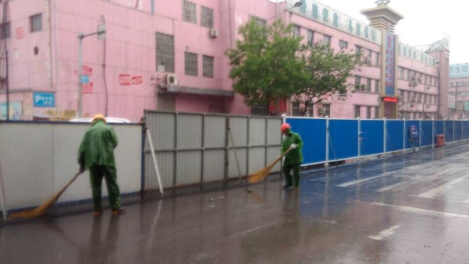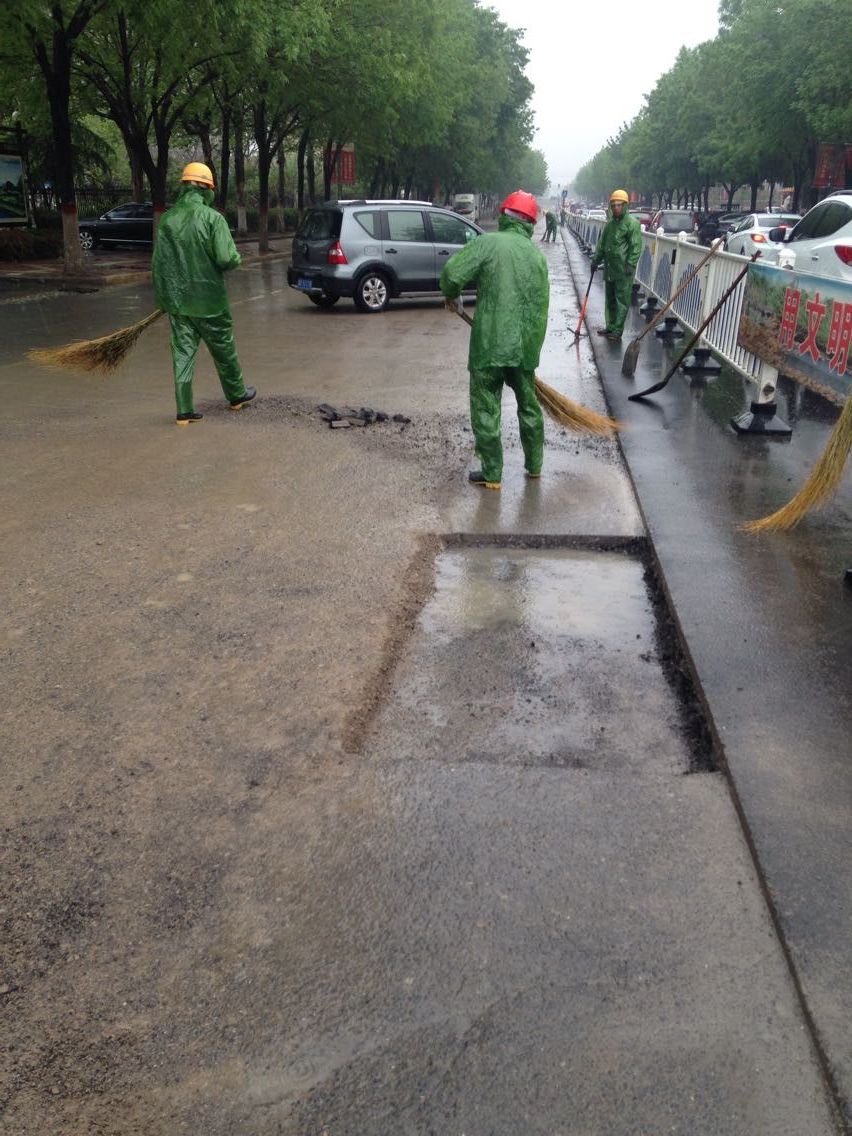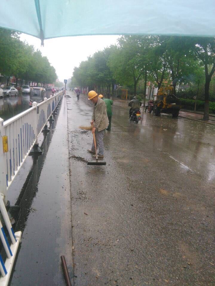 雨情就是命令,面對突如其來的降雨,工程項目部緊急啟動應(yīng)急預(yù)案,組織開展不受降雨影響的舊路面結(jié)構(gòu)層拆除和清掃工作。盡管雨不停地下著,卻澆不息現(xiàn)場施工人員保質(zhì)量、搶進(jìn)度的工作熱情。每個人都在認(rèn)真負(fù)責(zé)地堅守著自己的崗位。就連施工隊伍工人也受到這種熱烈氣氛的鼓舞,不停地舞動著他們手中的工具,清掃著。車輛、行人也在項目部成員的指揮下,井然有序的通行著。額頭上的是雨水、還是汗水也分辨不清,但大家仍精神飽滿,不敢懈怠,都全力為早一天開放交通,為市民出行提供方便而緊張工作。